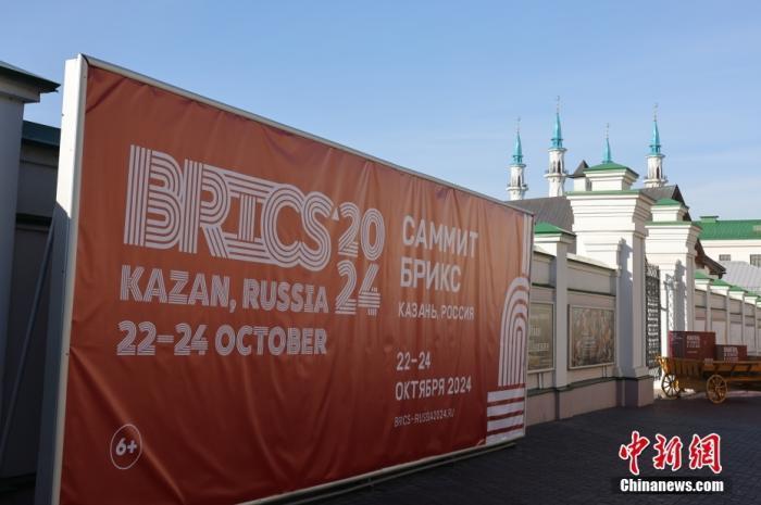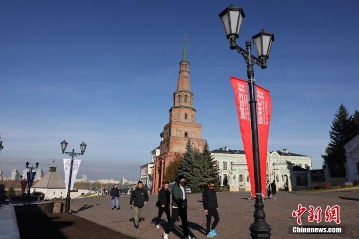 當(dāng)?shù)貢r間10月20日,俄羅斯喀山大街上懸掛著金磚峰會條幅。金磚國家領(lǐng)導(dǎo)人第十六次會晤于2024年10月22日至24日在俄羅斯喀山舉行。中新社記者 盛佳鵬 攝