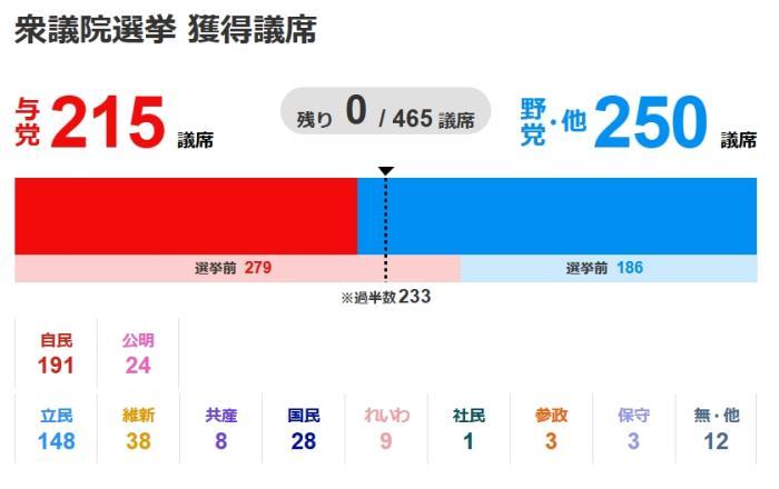 此次選舉后,自民黨和公明黨組成的執(zhí)政聯(lián)盟在國會的席位,從此前的279席大幅縮減至215席,失掉多數(shù)地位。