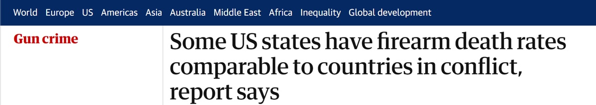 中國(guó)日?qǐng)?bào)網(wǎng)11月4日電 據(jù)英國(guó)《衛(wèi)報(bào)》網(wǎng)站10月30日?qǐng)?bào)道,“英聯(lián)邦基金”(Commonwealth Fund)的一項(xiàng)新報(bào)告發(fā)現(xiàn),一些州雖然在全美范圍內(nèi)屬于槍支死亡率最低的地區(qū),但也遠(yuǎn)高于同等發(fā)達(dá)國(guó)家。更可怕的是,美國(guó)部分州的槍支死亡率甚至與世界上一些發(fā)生沖突的國(guó)家和地區(qū)相當(dāng)。