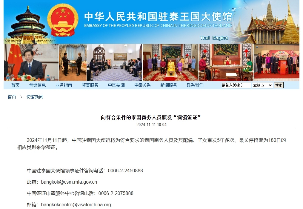 央視網(wǎng)消息:據(jù)中國駐泰國大使館消息,2024年11月11日起,中國駐泰國大使館將為符合要求的泰國商務(wù)人員及其配偶、子女審發(fā)5年多次、最長停留期為180日的相應(yīng)類別來華簽證。