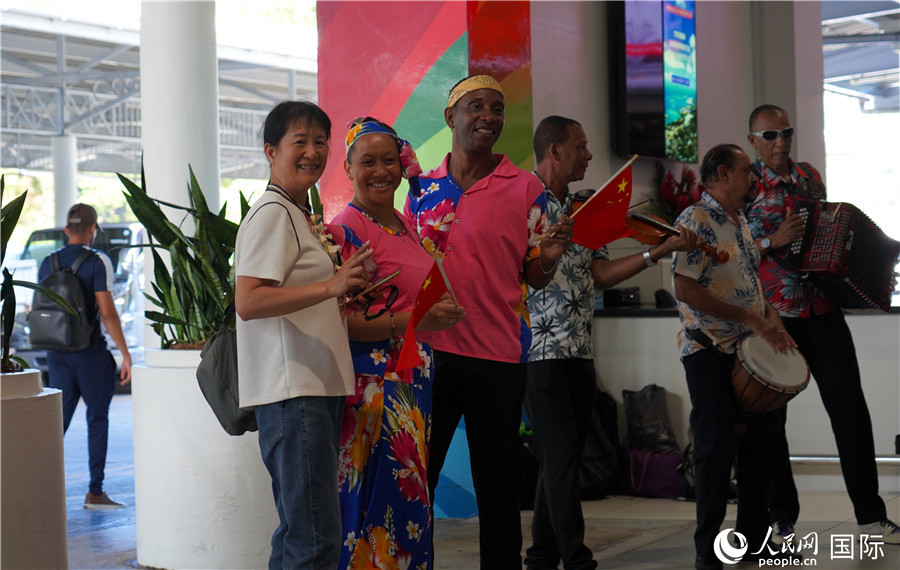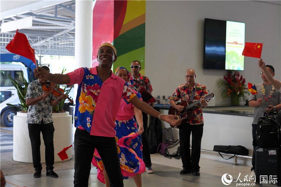 塞舌爾當(dāng)?shù)孛癖娸d歌載舞歡迎來自中國的首航乘客。人民網(wǎng)記者 黃煒鑫攝