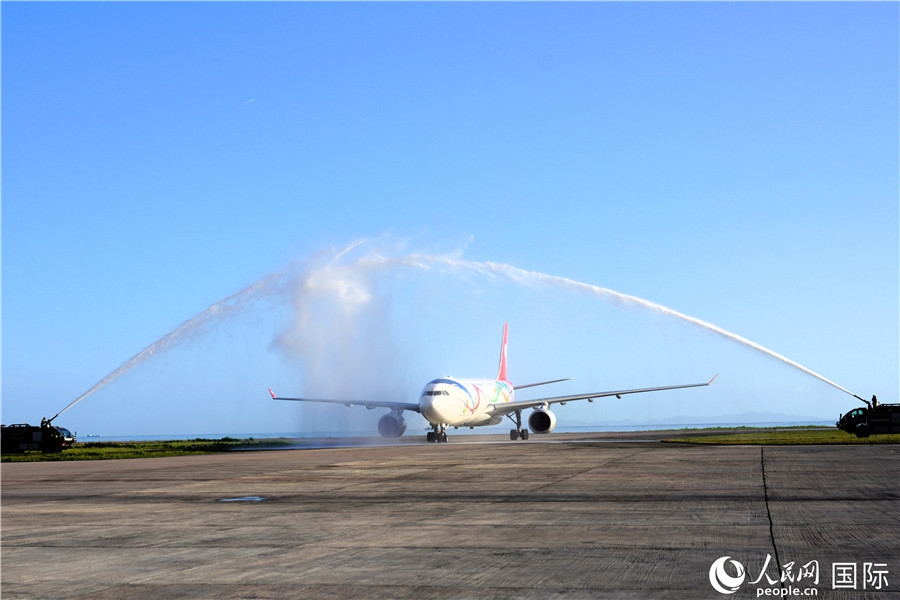 當(dāng)?shù)貢r間11月19日,成都直飛塞舌爾包機(jī)順利抵達(dá)塞舌爾馬埃島國際機(jī)場,當(dāng)?shù)赜脟H民航最高禮儀“過水門”歡迎首航乘客。人民網(wǎng)記者 黃煒鑫攝