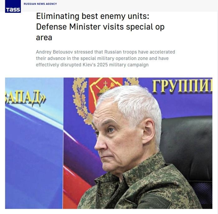 據(jù)報道,別洛烏索夫在視察特別軍事行動區(qū)時表示,俄軍加快了在特別軍事行動區(qū)的進攻速度,烏軍擬在2025年進行的行動已被打斷。他還稱,烏軍“最強的部隊已被殲滅”。