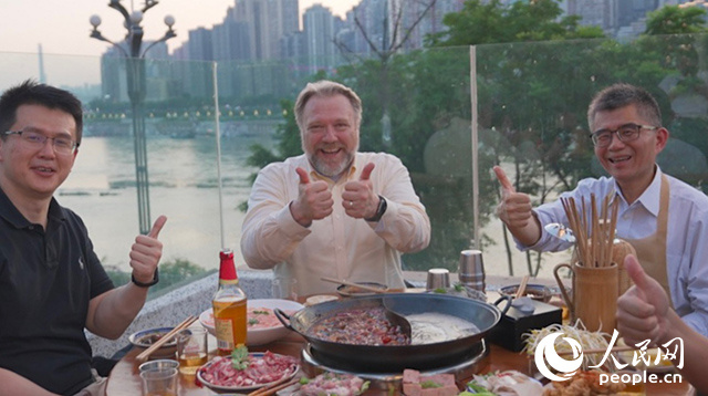 前康寧顯示科技事業(yè)部全球拓建項目總監(jiān)軻寶華(中)和同事在重慶南濱路吃火鍋。人民網(wǎng)記者 蘇纓翔攝
