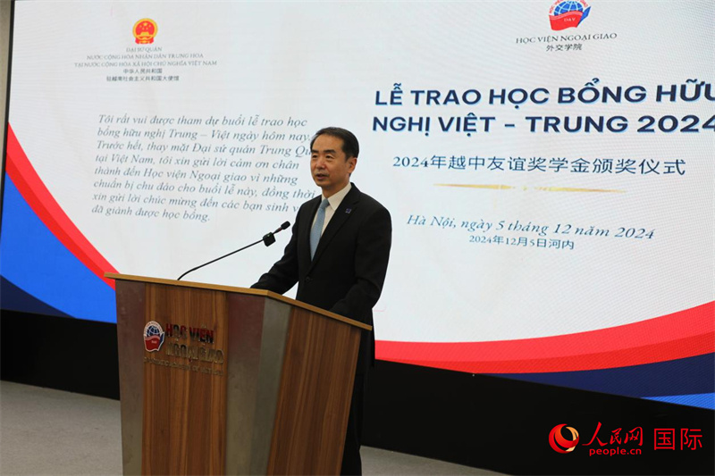人民網(wǎng)河內(nèi)12月6日電 (記者楊曄)12月5日,中國駐越南大使何煒赴越南外交學(xué)院出席“中越友好獎(jiǎng)學(xué)金”頒發(fā)儀式。越南外交學(xué)院代院長阮雄山偕師生代表近100人出席。