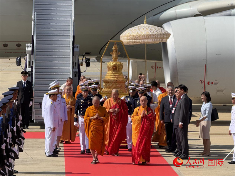 北京靈光寺佛牙舍利抵達(dá)泰國曼谷廊曼軍用機(jī)場。人民網(wǎng)記者 章念生攝