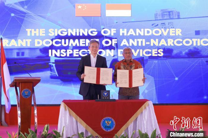 12月6日,中國(guó)援印尼毒品檢測(cè)設(shè)備交接儀式舉行。中國(guó)駐印尼大使王魯彤和印尼國(guó)家禁毒委員會(huì)主席馬蒂努斯分別代表中印尼兩國(guó)政府簽署了設(shè)備交接證書(shū)。中新社記者 李志全 攝