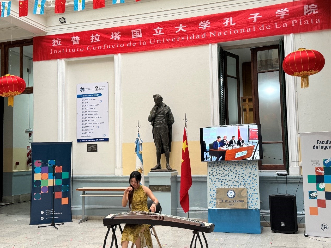慶?;顒蝇F(xiàn)場古箏獨奏表演。阿根廷拉普拉塔國立大學孔子學院供圖