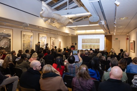 燕東升介紹了中國(guó)畫中蘊(yùn)含的中國(guó)美學(xué)精神,及中瑞藝術(shù)交流的淵源與現(xiàn)狀,希望觀眾可以跟隨中國(guó)藝術(shù)家們的作品,享受一次美好的藝術(shù)之旅,并誠(chéng)摯邀請(qǐng)大家到中國(guó),感受中國(guó)的美景與美食,感受古老中國(guó)的青春活力。