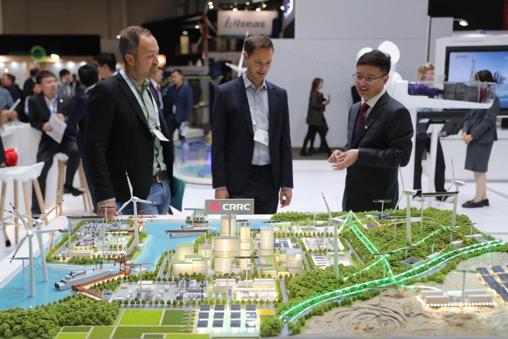 9月24日,在德國(guó)漢堡國(guó)際風(fēng)能展中國(guó)中車展區(qū),工作人員為參觀者講解沙盤模型。新華社記者杜哲宇攝