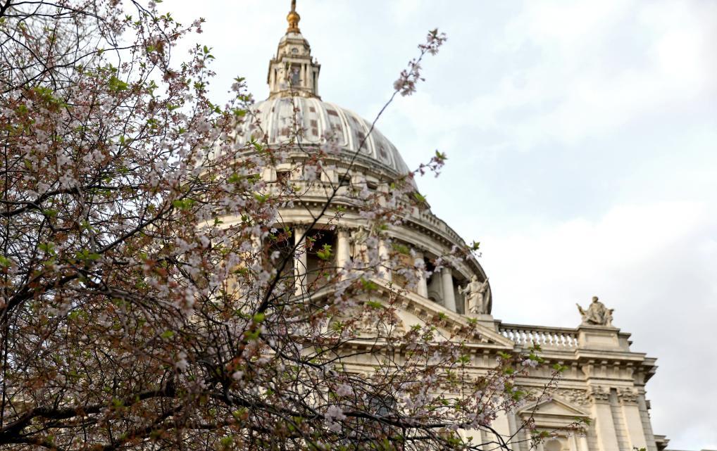 3月20日,在英國倫敦,櫻花盛開在圣保羅大教堂前。新華社記者李穎攝