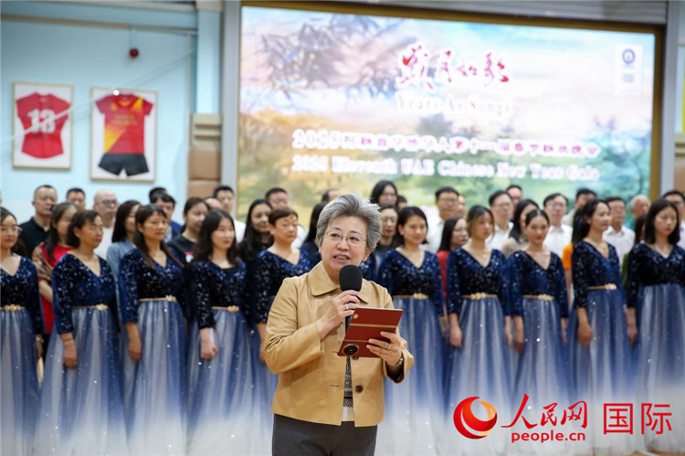 中國(guó)駐迪拜總領(lǐng)事歐渤芊領(lǐng)誦《我的祖國(guó)》。人民網(wǎng) 塔里克·易卜拉欣攝