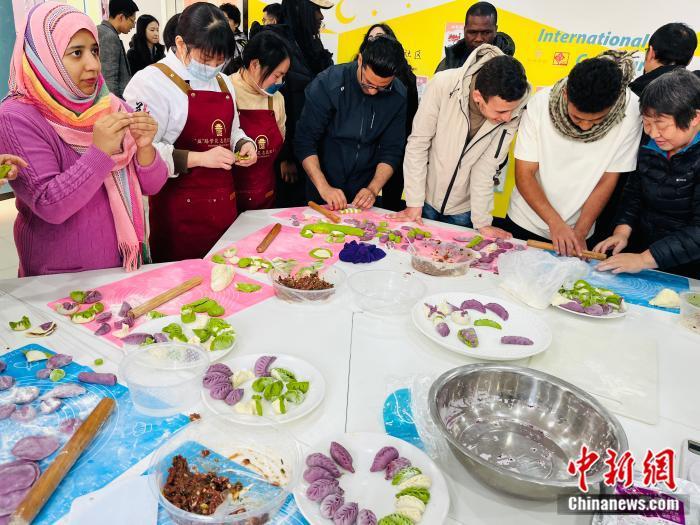 義烏雞鳴山社區(qū)組織中外居民包餃子活動。(中新網(wǎng) 趙麗 攝)