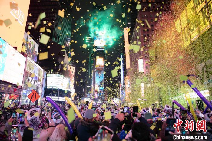 23時59分,持續(xù)了數(shù)小時的大雨已停,時報廣場大屏幕開始顯示倒數(shù)。在此起彼伏的歡呼聲中,由2688塊三角形水晶板組成的水晶球緩緩落下,絢麗的煙火隨之綻放,成千上萬寫有新年愿望的彩色紙片在空中飄灑。人們在音樂和歡呼聲中迎來新年。