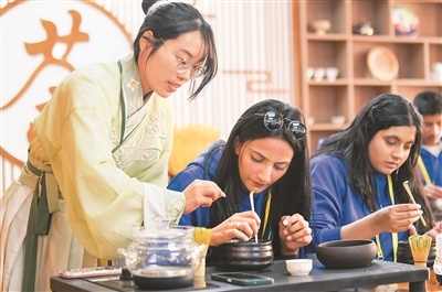 2024年4月15日,2024年“漢語橋”上海合作組織國家青年學(xué)生春令營(yíng)開營(yíng)儀式在新疆師范大學(xué)舉行。來自8個(gè)上合組織國家的近500名青年學(xué)生參加了此次春令營(yíng)。圖為參加春令營(yíng)的來華青年學(xué)生在新疆師范大學(xué)學(xué)生(左)的指導(dǎo)下學(xué)習(xí)茶藝。