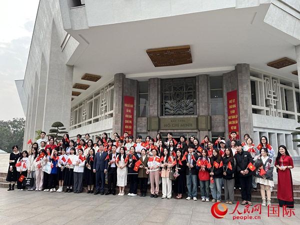 中越兩國青年學(xué)子在胡志明博物館前合影留念。人民網(wǎng)記者 楊曄攝