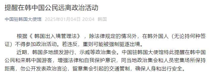 央視網(wǎng)消息:中國(guó)駐韓國(guó)大使館1月4日提醒:根據(jù)《韓國(guó)出入境管理法》,除法律規(guī)定的情況外,在韓外國(guó)人(無(wú)論持何種簽證)不得參加政治活動(dòng)。若違反,重則可能被強(qiáng)制驅(qū)逐出境。