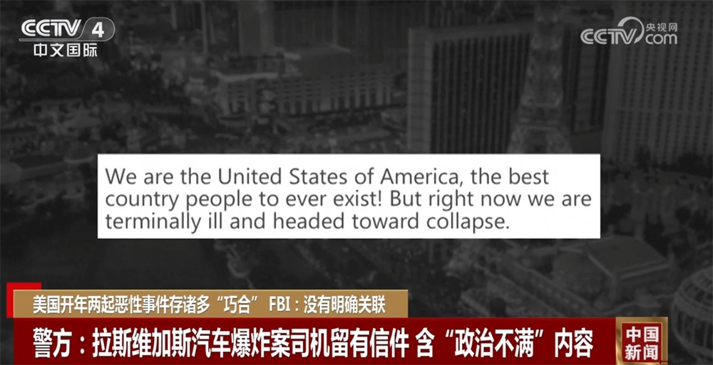 央視網(wǎng)消息:美國1月1日相繼發(fā)生新奧爾良汽車撞人事件和拉斯維加斯特朗普酒店門前汽車爆炸事件,兩起事件已造成至少16人死亡,數(shù)十人受傷,引發(fā)美國輿論廣泛關(guān)注和擔(dān)憂。據(jù)美國媒體報(bào)道,兩起事件存在諸多“巧合”。不過,美國聯(lián)邦調(diào)查局官員3日重申,這兩起事件沒有明確關(guān)聯(lián)。