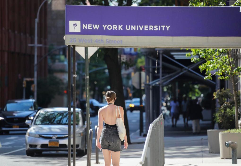 2020年7月14日,一名女子從美國(guó)紐約大學(xué)的教學(xué)樓前走過(guò)。新華社記者王迎攝