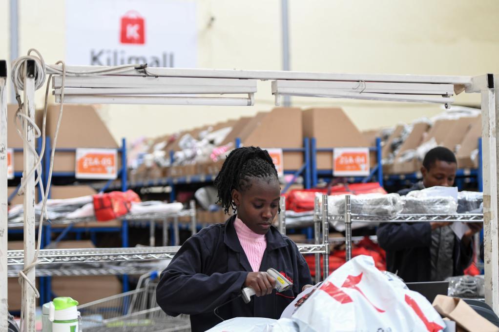 2023年7月28日,在肯尼亞姆洛隆戈,湖南長沙非拓信息技術(shù)有限公司旗下電商平臺(tái)Kilimall的員工在倉庫內(nèi)分揀貨物。(新華社記者李亞輝攝)