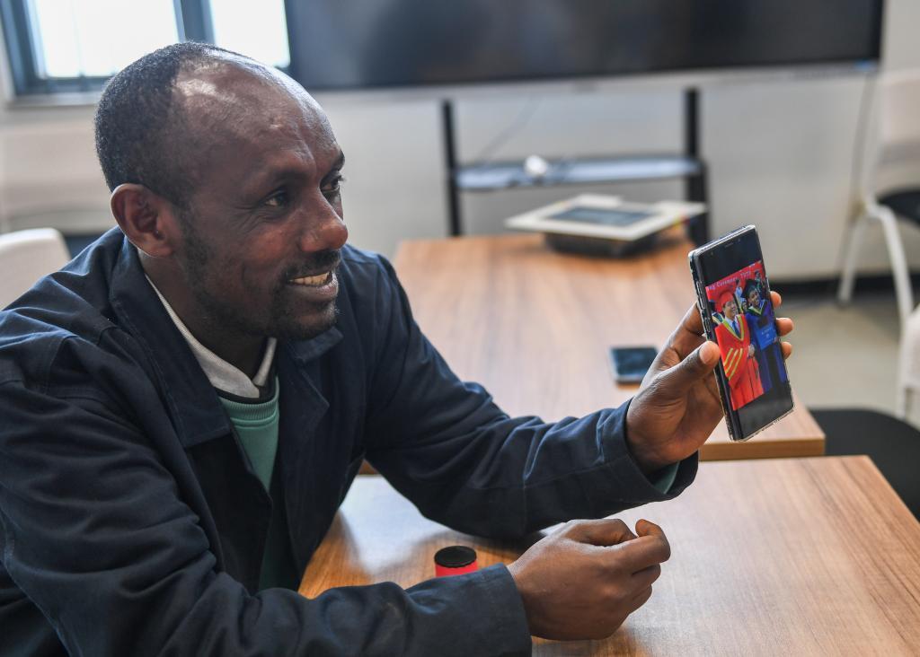 2024年2月15日,在位于亞的斯亞貝巴的埃塞俄比亞聯(lián)邦職業(yè)技術(shù)培訓(xùn)學(xué)院,魯班工坊當(dāng)?shù)亟處熂s納斯·阿凱萊(中文名艾友涵)展示在中國學(xué)習(xí)時(shí)的照片。(新華社記者李亞輝攝)