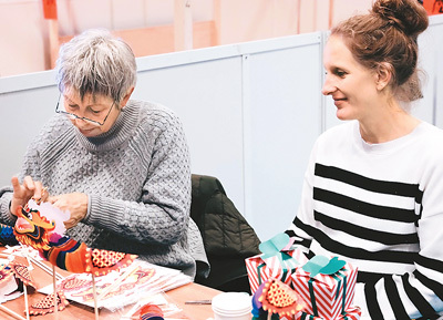 觀眾在博覽會(huì)現(xiàn)場(chǎng)體驗(yàn)中國(guó)龍工藝品制作。