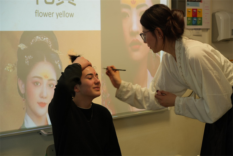開放日活動古今呼應,為師生提供了了解中國體育項目、傳統(tǒng)服飾、中國書法、民樂民族舞以及中國美食茶飲的機會。師生紛紛嘗試傳統(tǒng)禮儀和宴飲游戲投壺,對非物質文化遺產(chǎn)簪花項目興趣盎然。中國書法吸引了大批興奮的觀眾和體驗者,師生紛紛用毛筆寫下自己的中文名字。來賓們在茶香中聆聽了悠遠的二胡演奏,觀賞了民族舞《白蛇·緣起》,中國美食的香氣吸引了在校的其他老師前來品鑒。