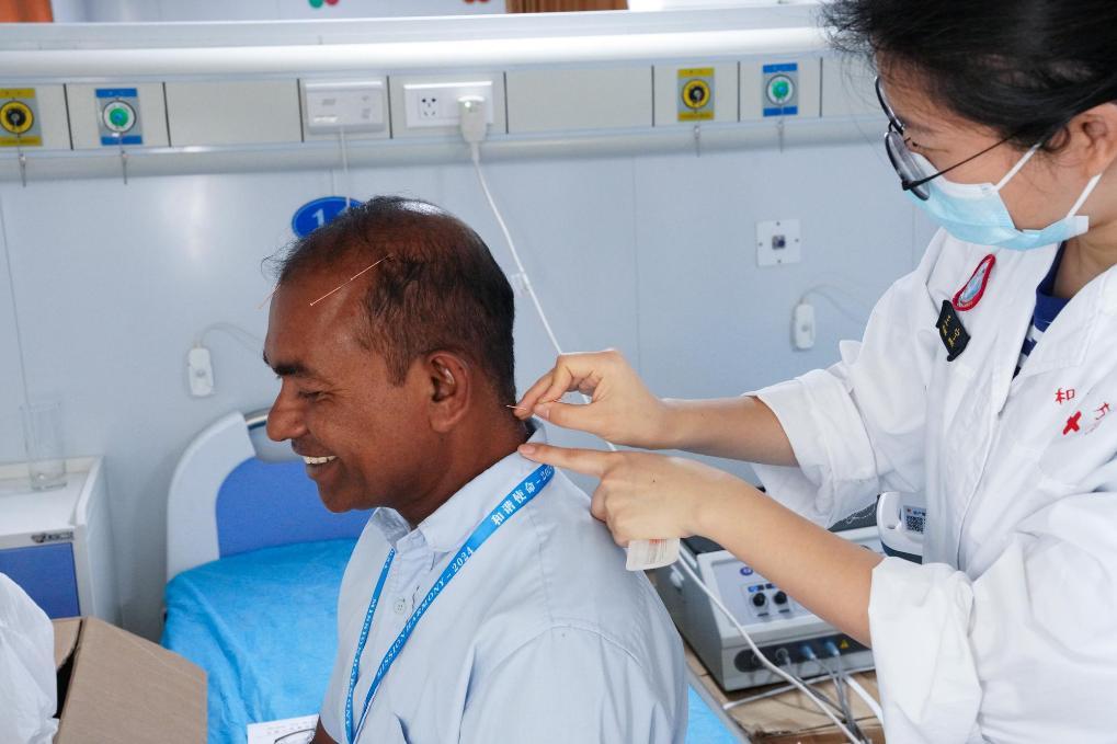 2024年12月24日,在斯里蘭卡科倫坡港,中國海軍“和平方舟”號醫(yī)院船上的醫(yī)生為當?shù)鼐用褡鲠樉?。新華社記者伍岳攝