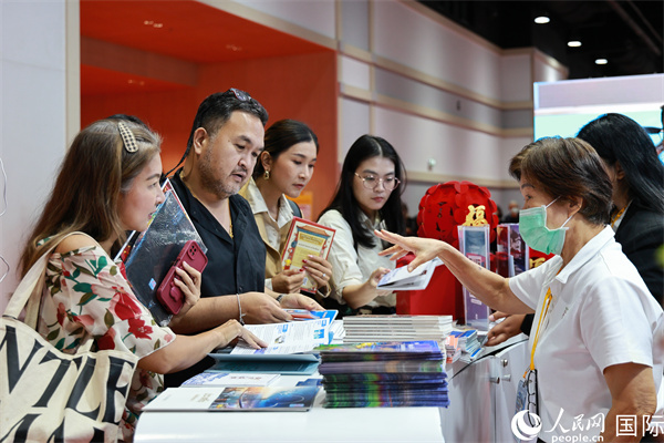 外國觀眾在中國展臺仔細閱讀赴華旅游介紹,向工作人員咨詢關(guān)于中國美食和景點的詳細信息。人民網(wǎng)記者 白元琪攝