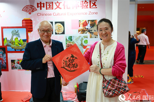 本地觀眾在中國文化體驗區(qū)展示書法作品。人民網(wǎng)記者 白元琪攝