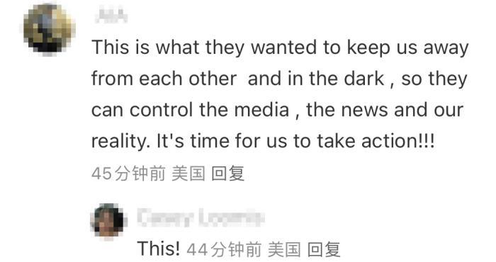 還有美國(guó)網(wǎng)友憤怒評(píng)價(jià)道,“(美國(guó))政客們表現(xiàn)得好像我們的聲音很重要,但他們沒(méi)有這樣做!都毫不在乎!”“這就是他們想要的,讓我們遠(yuǎn)離彼此,處于黑暗之中,這樣他們就可以控制媒體和我們的現(xiàn)實(shí)生活。是時(shí)候采取行動(dòng)了!”