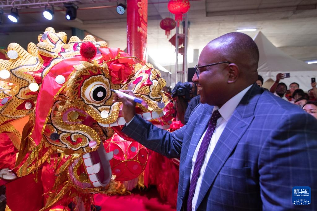 1月19日,贊比亞外交與國際合作部長漢貝在首都盧薩卡舉行的春節(jié)廟會活動上為舞龍點睛。新華社記者 彭立軍 攝