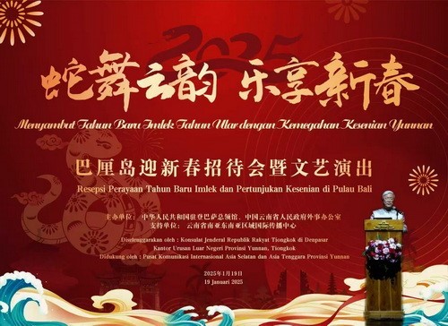 人民網(wǎng)雅加達(dá)1月22日電(記者李培松)1月19日,中國駐登巴薩總領(lǐng)館在印度尼西亞巴厘島舉辦2025年春節(jié)招待會暨云南省歌舞團(tuán)慶新春專場演出。中國駐登巴薩總領(lǐng)事張志昇和巴厘省代理省長代表、省文化局局長蘇吉爾達(dá)出席并致辭。領(lǐng)區(qū)政府官員、各界代表以及當(dāng)?shù)刂匈Y機(jī)構(gòu)、華僑華人等近700人出席。