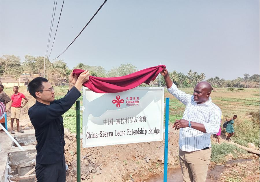 中國(guó)駐塞拉利昂大使王擎(左)和博城市市長(zhǎng)穆薩(右)為中國(guó)—塞拉利昂友誼橋揭牌。中國(guó)援塞農(nóng)業(yè)專家組供圖