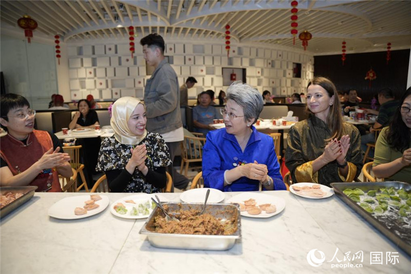中國駐迪拜總領(lǐng)事歐渤芊與參與活動(dòng)的外國友人一同包餃子。人民網(wǎng) 塔里克·易卜拉欣攝