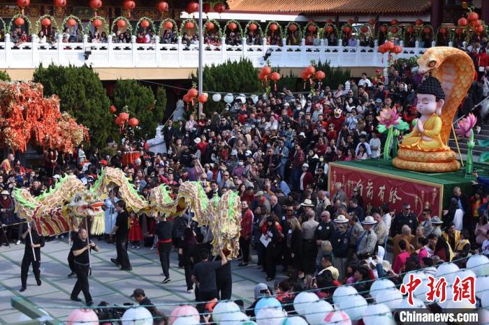 當(dāng)?shù)貢r(shí)間1月29日,一場(chǎng)春節(jié)慶典于乙巳蛇年大年初一在美國(guó)著名佛教圣地佛光山西來(lái)寺舉行。圖為人們?cè)诖笮蹖毜钋坝^看舞龍等新春文藝表演。 中新社記者 張朔 攝