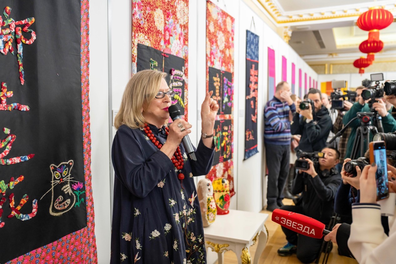 伊琳娜·扎哈羅娃是藝術學博士、俄羅斯普希金造型藝術博物館高級研究員。她隨丈夫扎哈羅夫在中國生活期間深入鉆研中國民間藝術,她的作品將中國書法與織物刺繡巧妙結合。開幕式上,她向現(xiàn)場觀眾講述了多幅作品的創(chuàng)作過程和文化含義,表示每一幅作品都傾注了她對中國文化的熱愛。