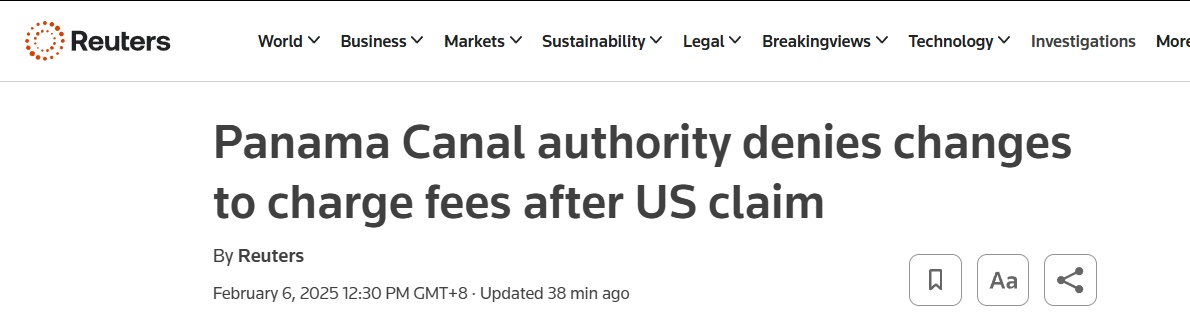 當(dāng)?shù)貢r間2月5日晚間,巴拿馬運河管理局就美國政府當(dāng)天稍早時的一份聲明發(fā)表回應(yīng)聲明。巴拿馬運河管理局在聲明中否認(rèn)了美國國務(wù)院當(dāng)日早些時候所說的“美國政府船只現(xiàn)在可免費通過巴拿馬運河”的內(nèi)容,表示相關(guān)資費沒有任何調(diào)整。