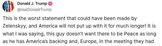 3日晚些時候,美國總統(tǒng)特朗普在社交媒體上發(fā)文,對澤連斯基的最新視頻聲明作出回應(yīng)。特朗普表示,烏克蘭總統(tǒng)澤連斯基的聲明可能是他做出的“最糟糕的”聲明,美國“不會再容忍更久了”。