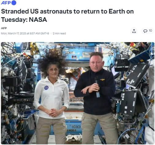 據(jù)報道,當(dāng)天,NASA發(fā)布聲明稱,在國際空間站滯留9個月的NASA宇航員蘇尼·威廉姆斯和布奇·威爾莫爾,定于當(dāng)?shù)貢r間18日下午17點57分,在美國佛羅里達(dá)海岸附近的海域著陸。兩人返回地球的最早著陸時間原先設(shè)定在當(dāng)?shù)貢r間19日。