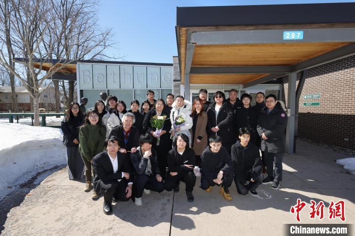 當?shù)貢r間3月17日,位于白求恩家鄉(xiāng)加拿大安大略省穆斯科卡地區(qū)的杜威白求恩醫(yī)學護理學院和杜威公學舉行白求恩大夫誕辰135周年紀念活動。圖為校方師生和大多倫多地區(qū)華人社區(qū)代表共同赴白求恩出生地穆斯科卡地區(qū)格雷文赫斯特鎮(zhèn)的白求恩紀念館拜謁,向白求恩塑像獻花。中新網(wǎng)記者 余瑞冬 攝