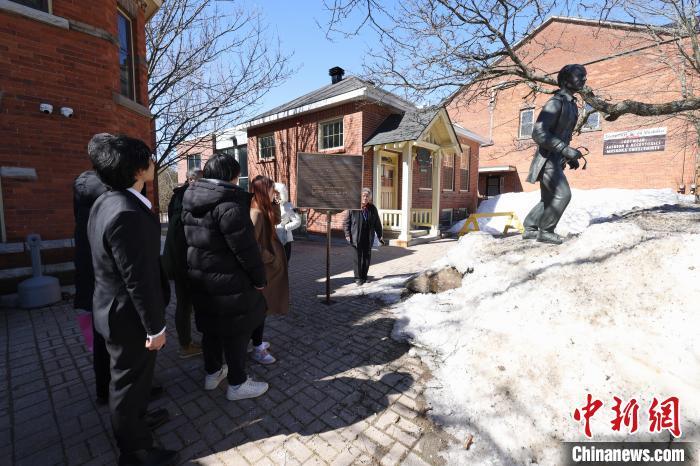 當?shù)貢r間3月17日,位于白求恩家鄉(xiāng)加拿大安大略省穆斯科卡地區(qū)的杜威(Dewey)白求恩醫(yī)學護理學院和杜威公學舉行白求恩大夫誕辰135周年紀念活動。圖為校方師生和大多倫多地區(qū)華人社區(qū)代表在白求恩出生地穆斯科卡地區(qū)格雷文赫斯特鎮(zhèn)參觀白求恩塑像。中新網(wǎng)記者 余瑞冬 攝
