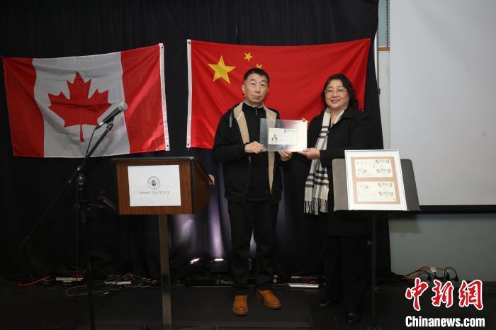 當?shù)貢r間3月17日,位于白求恩家鄉(xiāng)加拿大安大略省穆斯科卡地區(qū)的杜威白求恩醫(yī)學護理學院和杜威公學舉行白求恩大夫誕辰135周年紀念活動。圖為著名畫家、郵票設計家劉向平(左)向校方捐贈由其設計、中加兩國聯(lián)合發(fā)行的白求恩誕生一百周年郵票的紀念封。中新網(wǎng)記者 余瑞冬 攝