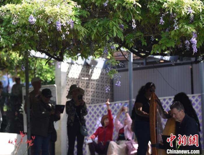 當(dāng)?shù)貢r(shí)間4月12日,2025年紫藤花節(jié)在美國(guó)加利福尼亞州洛杉磯郡塞拉馬德雷市舉行。圖為人們?cè)凇白咸倩▓@”欣賞音樂(lè)、觀賞花朵。 中新社記者 張朔 攝
