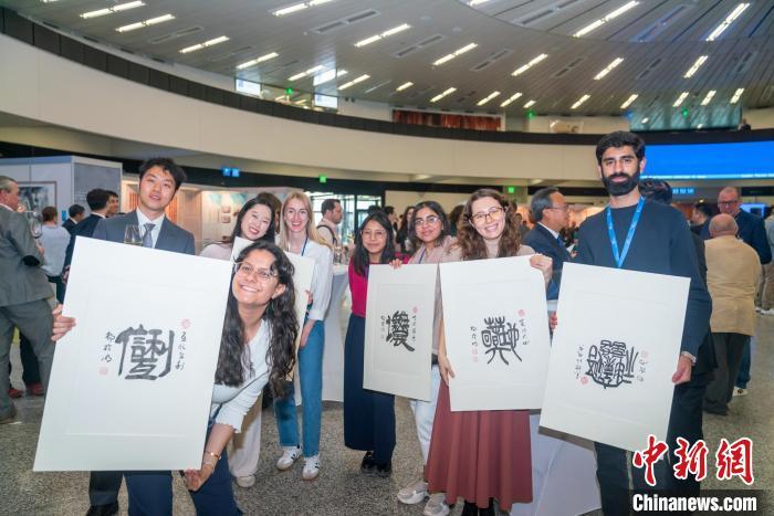 當(dāng)?shù)貢r間4月14日,慶祝2025年聯(lián)合國中文日系列活動在維也納聯(lián)合國總部開幕。圖為當(dāng)日來賓展示書法作品。(中國常駐維也納代表團供圖)