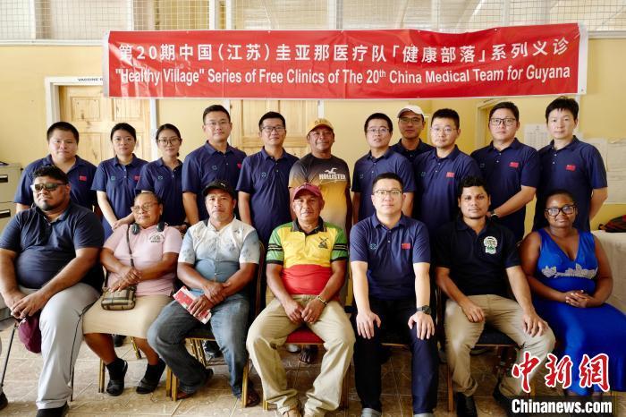 義診結(jié)束后,圭亞那莫萊科拜村酋長(zhǎng)、部分村民、印第安事務(wù)部陪同人員和中國(guó)醫(yī)療隊(duì)隊(duì)員合影留念。第20期中國(guó)(江蘇)援圭亞那醫(yī)療隊(duì)供圖