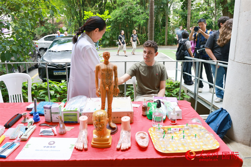 文化體驗(yàn)區(qū)熱鬧非凡。書(shū)法臺(tái)前,孩子們滿懷好奇地蘸墨揮毫,第一次寫下自己的中文名字;茶藝展區(qū),體驗(yàn)者在茶香氤氳之間品味東方意境;中醫(yī)展區(qū),許多巴西民眾仔細(xì)聆聽(tīng)講解,嘗試拔罐、推拿等中醫(yī)療法。