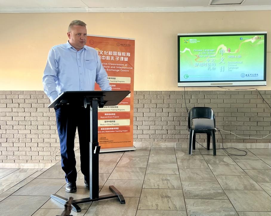 活動(dòng)伊始,卡特洪工程??茖W(xué)校校長(zhǎng)歐普曼先生致辭歡迎。他深情回顧了2024年參與“漢語(yǔ)橋”南非校長(zhǎng)訪華團(tuán)的經(jīng)歷,分享了對(duì)中華文化的贊嘆和對(duì)中文教育的高度肯定。他表示,中文不僅是一種溝通工具,更是一把開啟未來(lái)之門的鑰匙,將為南非學(xué)子鋪就通向世界的橋梁。