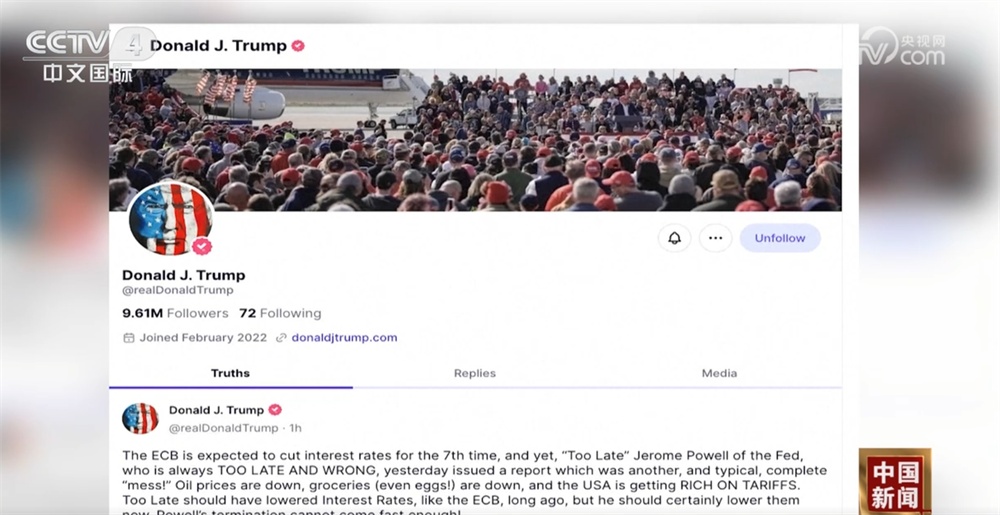 特朗普當(dāng)天表示,通貨膨脹正在下降,鮑威爾應(yīng)該通過降低利率來回應(yīng)。特朗普還說,他認(rèn)為鮑威爾沒有盡職,做事總是太慢太遲。
