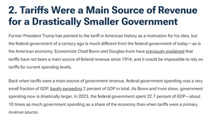 而且,一個世紀(jì)前的美國政府與今天大不相同。關(guān)稅是政府收入的主要來源時,聯(lián)邦政府支出僅占GDP的很小一部分,僅略高于GDP總額的2%。2023年,聯(lián)邦政府支出占GDP的22.7%,是之前百分比的十倍。所得稅帶來的收入顯然無法被關(guān)稅取代。